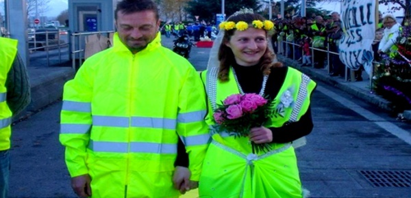 ناظورسيتي | صحف في بادرة فريدة من نوعها أقدم ناشطين من "احتجاجات السترات الصفراء" على عقد زواجهما، أثناء التظاهرات الاحتجاجية التي شهدتها فرنسا نهاية الأسبوع الماضي. وبحسب ما أوردته مصادر إعلامية فرنسية فإن مجموعة من النشطاء في مدينة "سيمياك" جنوبي فرنسا، قرروا الاحتفال بملابسهم الاحتجاجية وإحياء حفل زواج لفردين منهما. وأضافت ذات المصادر أن حوالي 200 شخص تجمعوا بمحطة قطارات المدينة، حيث الاحتجاجات، وتحول الأمر إلى حفل زواج صغير ارتدى فيه العروسان سترات صفراء. كما ارتدى العروسان خاتم الزواج في