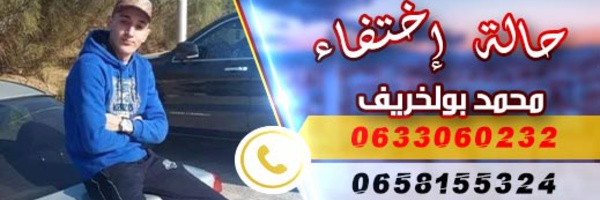 نداء اختفى الشاب، محمد بولخريف، المنحدر من مدينة الدريوش، والبالغ من العمر حوالي 20 سنة، عن الأنظار منذ حوالي أسبوع. وقالت عائلة الشاب المختفي، بأن ابنها قد خرج من المنزل يوم الخميس الماضي، ولم يعد له أثر، كما انقطعت أخباره بشكل نهائي. وأضافت العائلة، بأن أخر اتصال بينها وبين محمد كانت على الساعة العاشرة، من نفس اليوم الذي اختفى فيه.